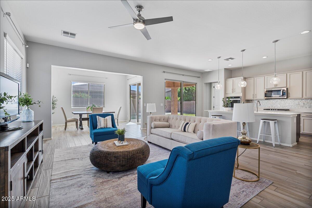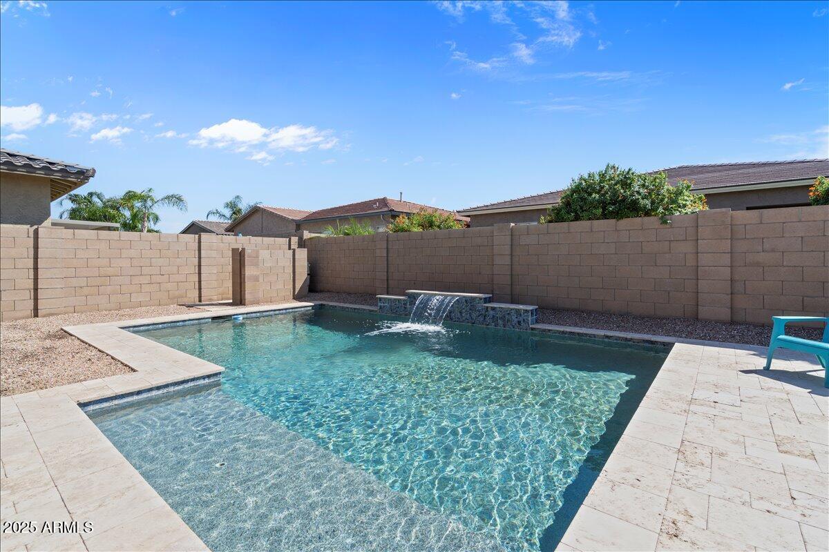 Welcome home! Built in 2018, this 3-bedroom, 2.5-bath home (with a versatile den that could easily become a 4th bedroom) is ready for you to move right in. You'll love the brand-new carpet, open floor plan, and stylish wood-plank tile floors. The kitchen and living areas flow beautifully together, perfect for everyday living and entertaining. Step outside to your sparkling private pool, or enjoy extra space with the tandem 3-car garage and R/O system. This home is perfectly located just three doors down from community park, playground, pool, and Faith Mather Sossaman Elementary—making it an ideal spot for both relaxation and connection.